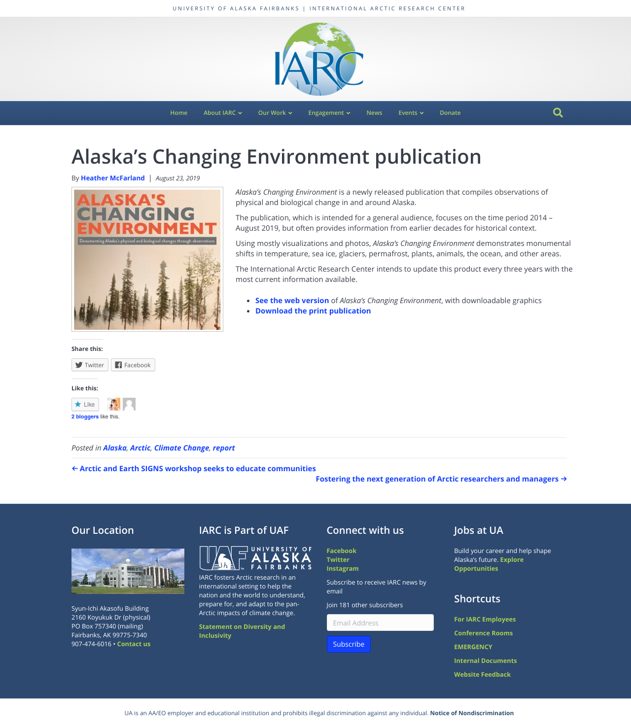 Alaska’s Changing Environment is a newly released publication that compiles observations of physical and biological change in and around Alaska. The publication, which is intended for a gener…