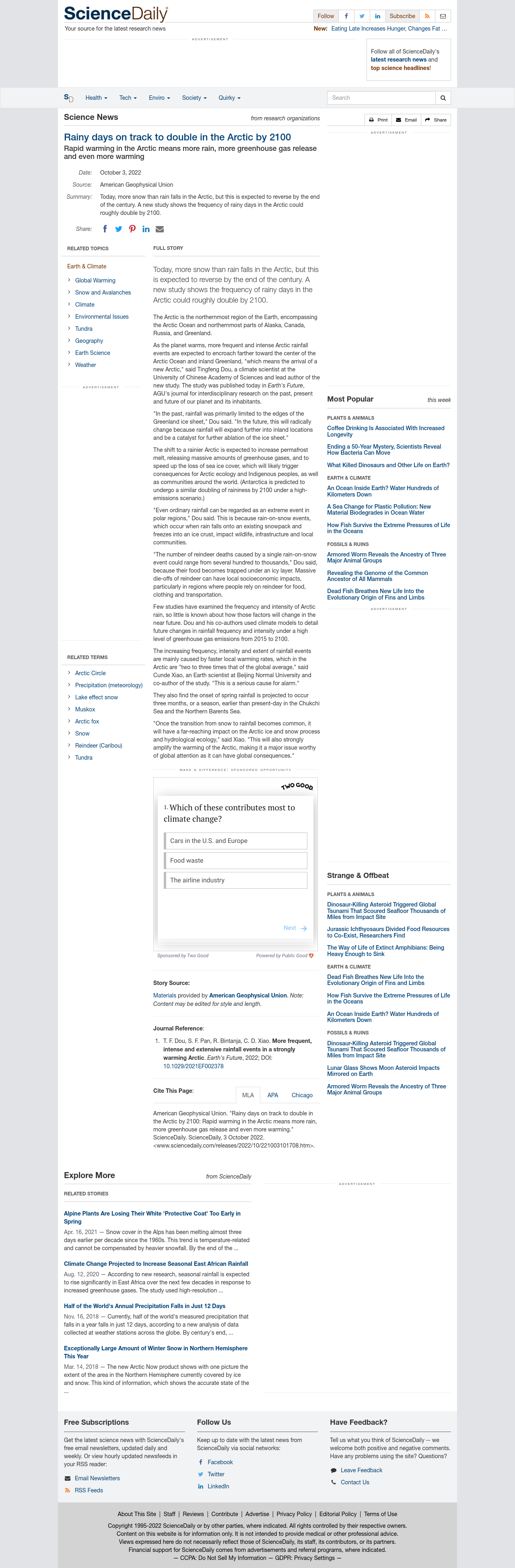 "Even ordinary rainfall can be regarded as an extreme event in polar regions," Dou said. This is because rain-on-snow events, which occur when rain falls onto an existing snowpack and freezes into an ice crust, impact wildlife, infrastructure and local communities.