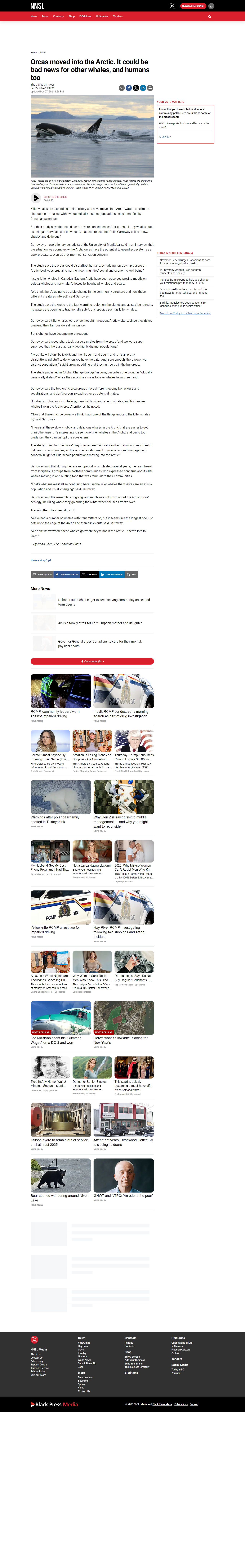 Orcas have begun to inhabit Arctic waters due to melting sea ice, posing threats to local whale species and potentially affecting Indigenous communities reliant on these ecosystems.