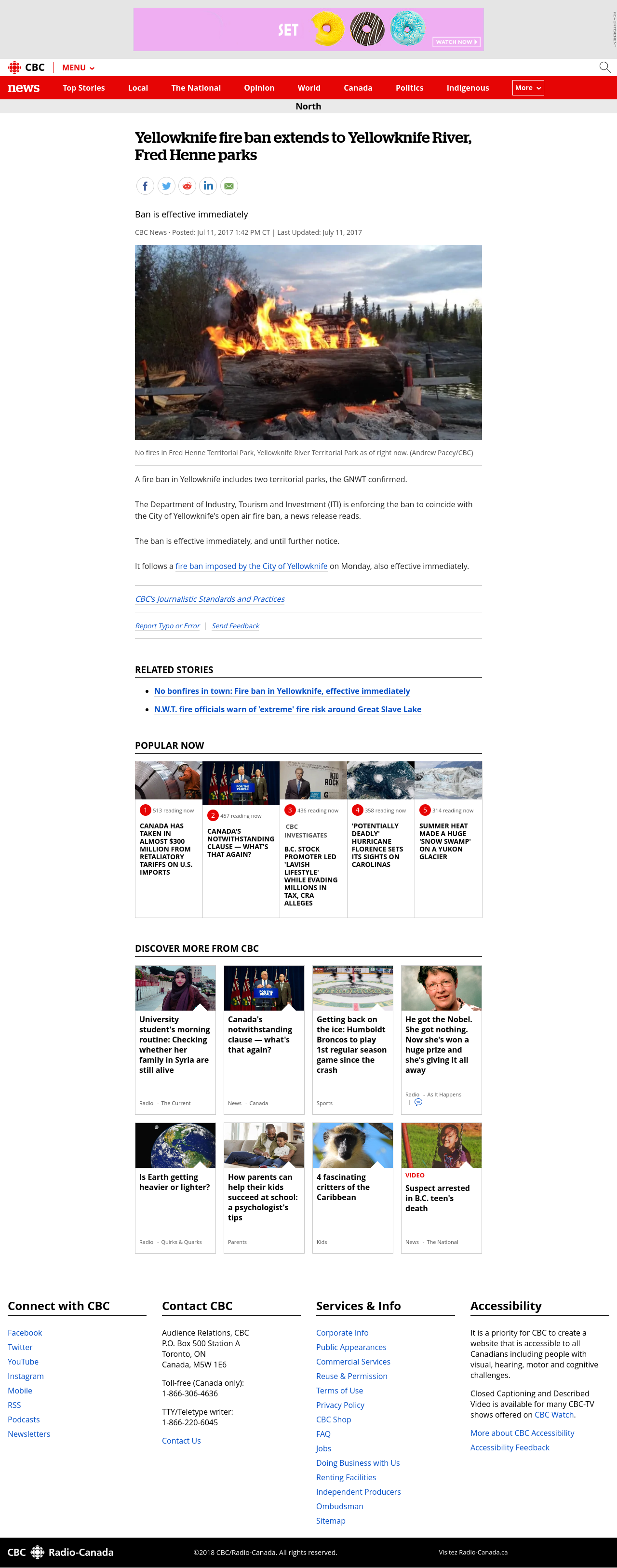 A fire ban, announced yesterday, includes two territorial parks, the GNWT confirmed.