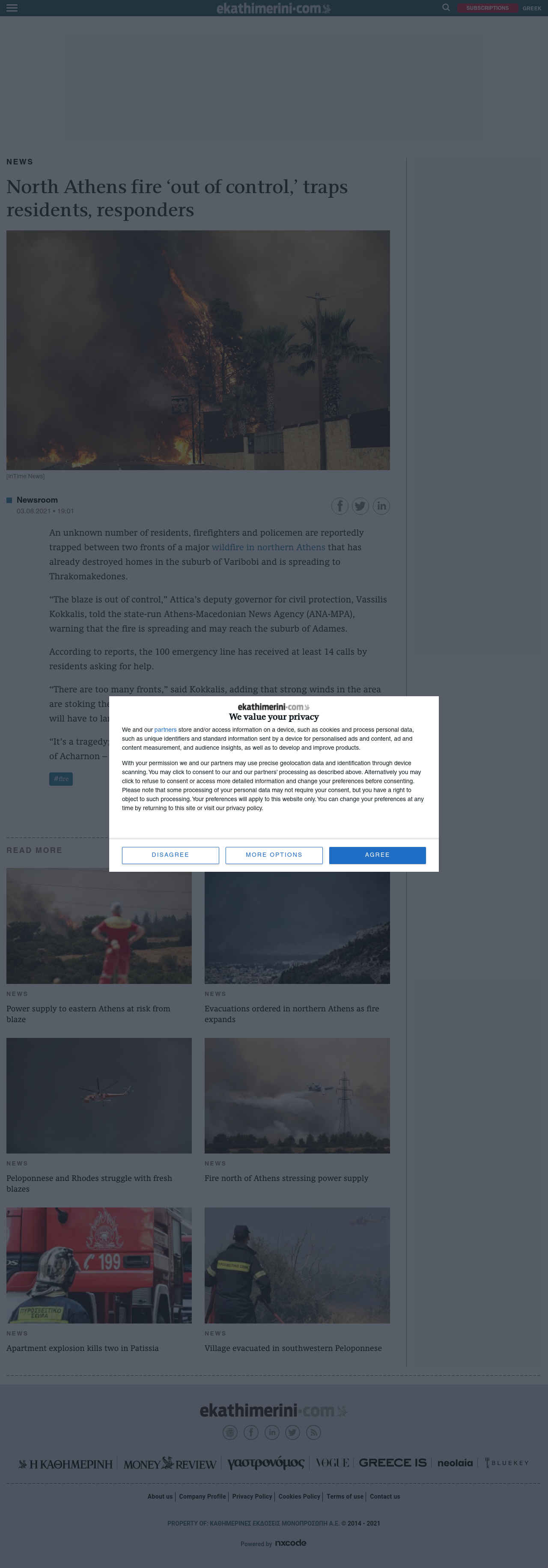 An unknown number of residents, firefighters and policemen are reportedly trapped between two fronts of a major wildfire in northern Athens that has already destroyed homes in the suburb of Varymbombi and is spreading to Thrakomakedones.