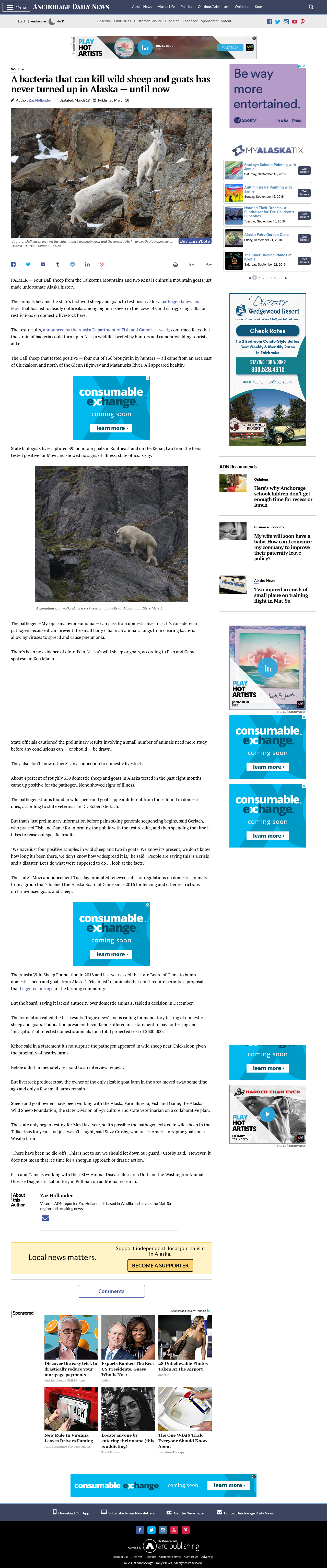 The animals became the state's first wild sheep and goats to test positive for a pathogen known as Movi that has led to deadly outbreaks among bighorn sheep in the Lower 48 and is triggering calls for restrictions on domestic livestock here.