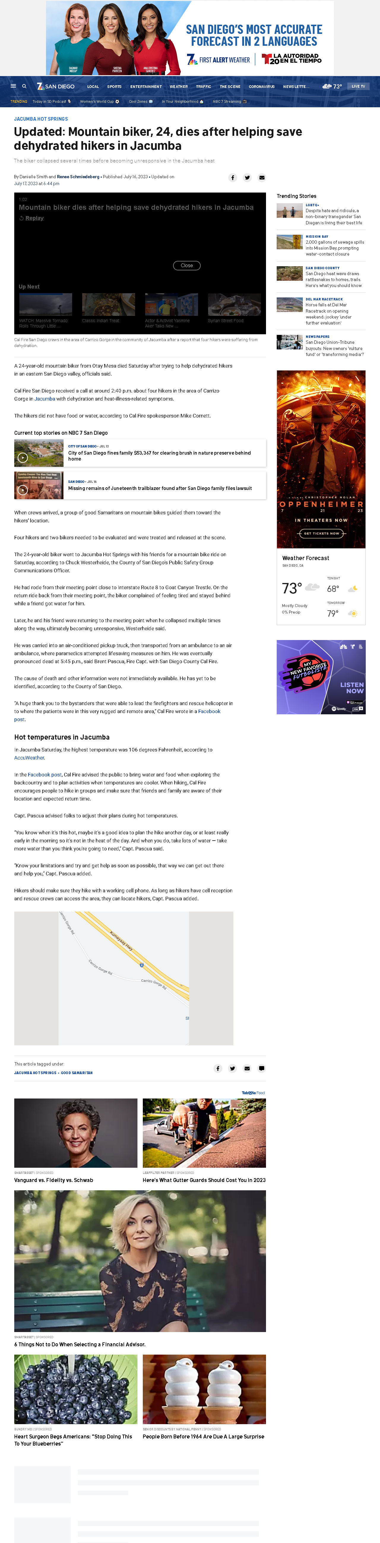 A mountain biker died Saturday after trying to help dehydrated hikers in an eastern San Diego valley, officials said.