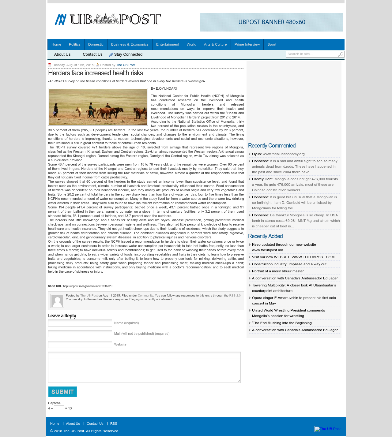 he National Center for Public Health (NCPH) of Mongolia has conducted research on the livelihood and health conditions of Mongolian herders and released recommendations on ways to improve their health and livelihood.