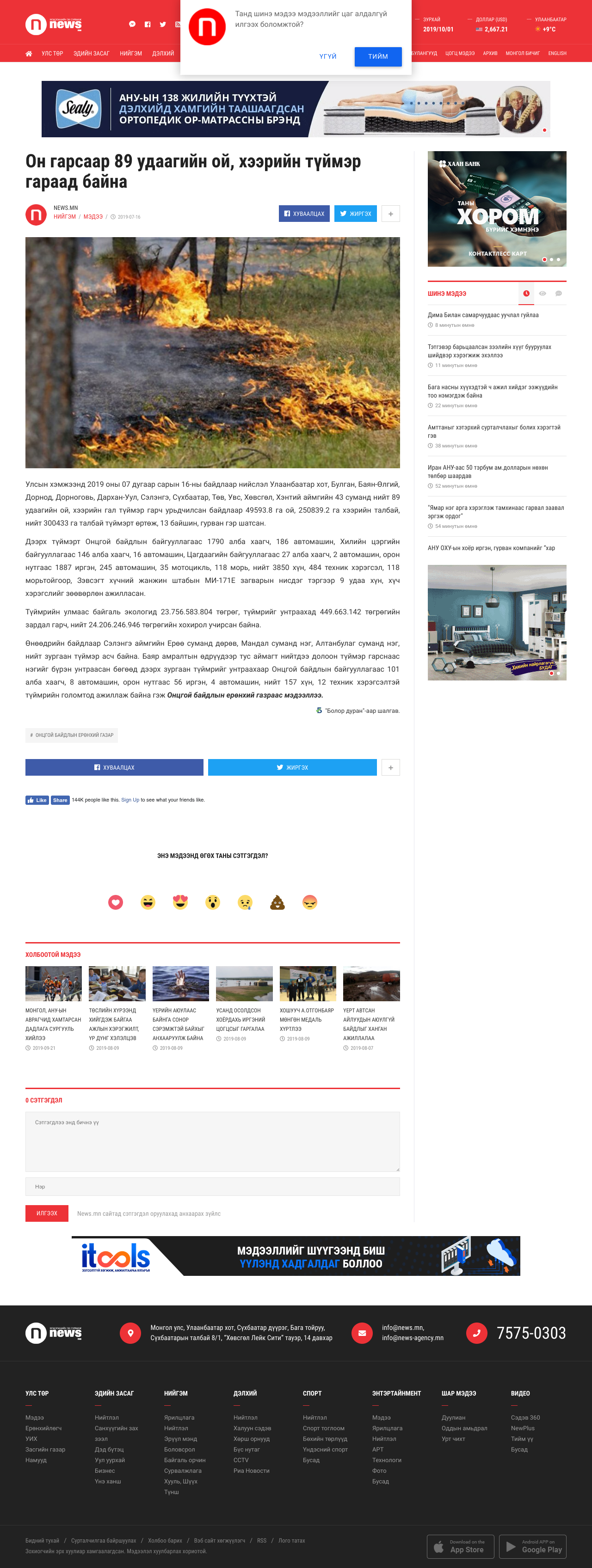 Улсын хэмжээнд 2019 оны 07 дугаар сарын 16-ны байдлаар нийслэл Улаанбаатар хот, Булган, Баян-Өлгий, Дорнод, Дорноговь, Дархан-Уул, Сэлэнгэ, Сүхбаатар, Төв, Увс, Хөвсгөл, Хэнтий аймгийн 43 суманд нийт 89 удаагийн ой, хээрийн гал түймэр гарч урьдчилсан байдлаар 49593.8 га ой, 250839.2 га хээрийн талбай, нийт 300433 га талбай түймэрт өртөж, 13 байшин, гурван гэр шатсан. Дээрх … 43 soums of Ulaanbaatar, Bulgan, Bayan-Ulgii, Dornod, Dornogovi, Darkhan-Uul, Selenge, Sukhbaatar, Tuv, Uvs, Khuvsgul and Khentii aimags.