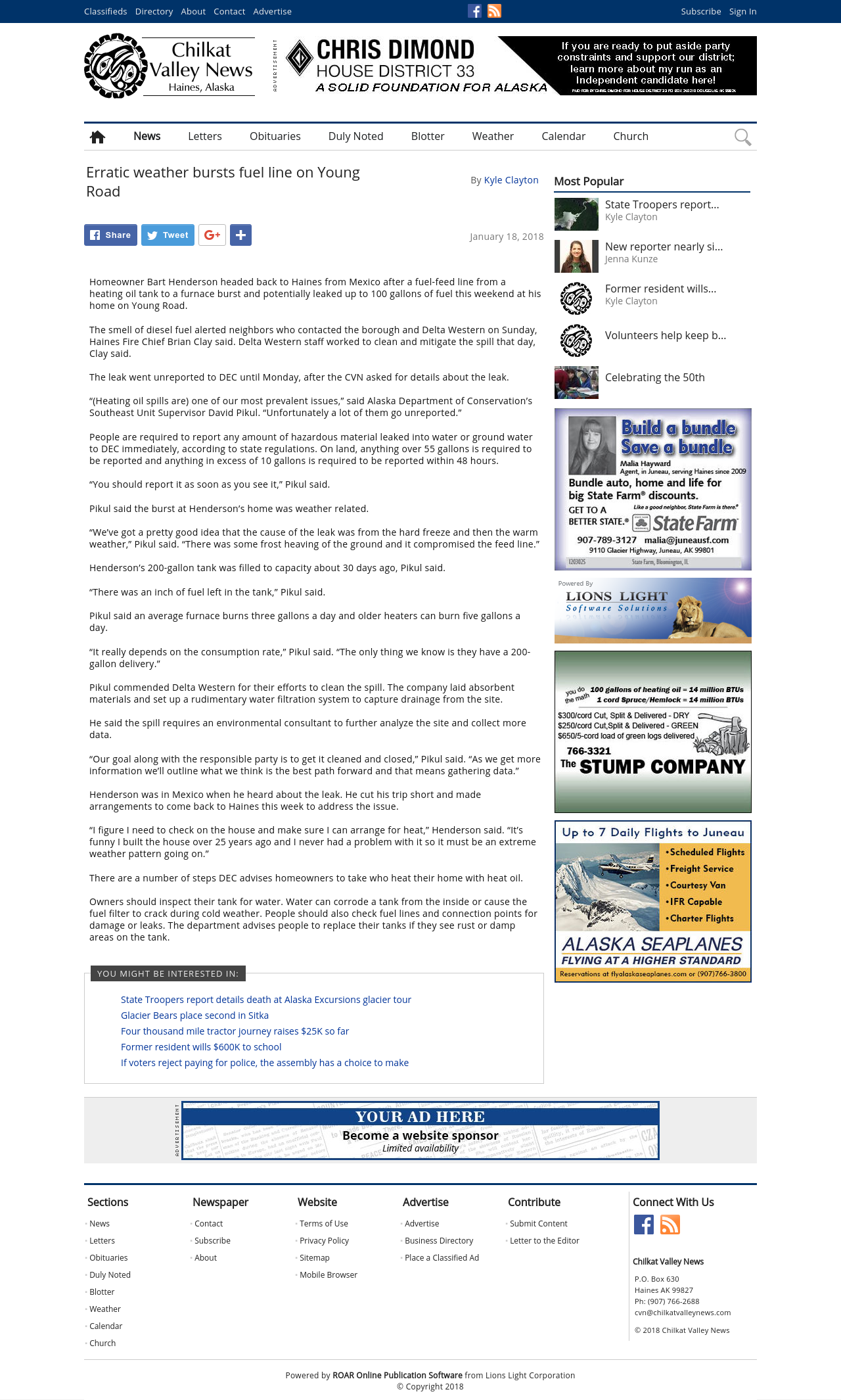 Homeowner Bart Henderson headed back to Haines from Mexico after a fuel-feed line from a heating oil tank to a furnace burst and potentially leaked. “We’ve got a pretty good idea that the cause of the leak was from the hard freeze and then the warm weather,” Pikul said. “There was some frost heaving of the ground and it compromised the feed line.”