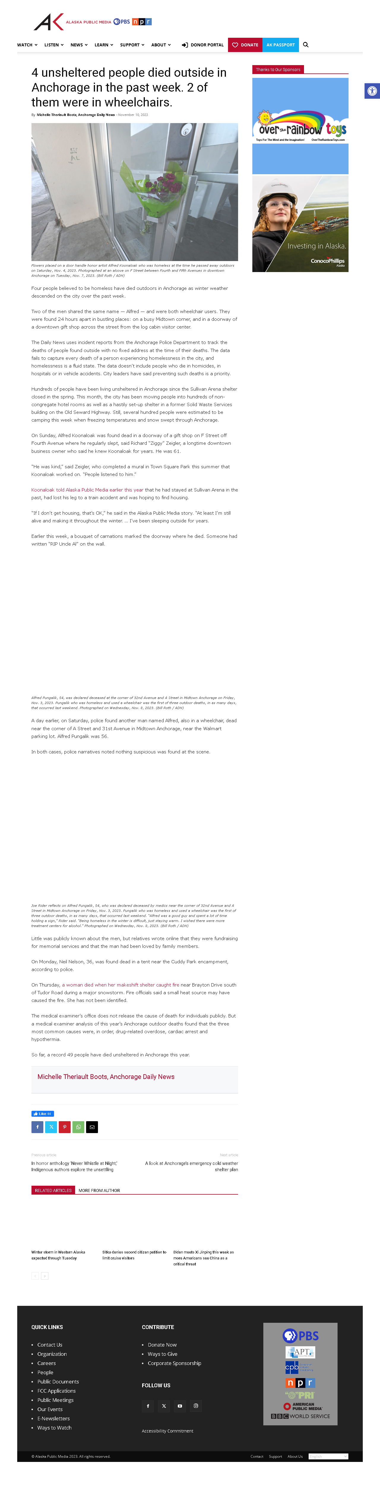 Four unsheltered people, two of whom were in wheelchairs, have died outdoors in Anchorage over the past week as winter weather hits the city, highlighting the ongoing issue of homelessness and the need for preventative measures.