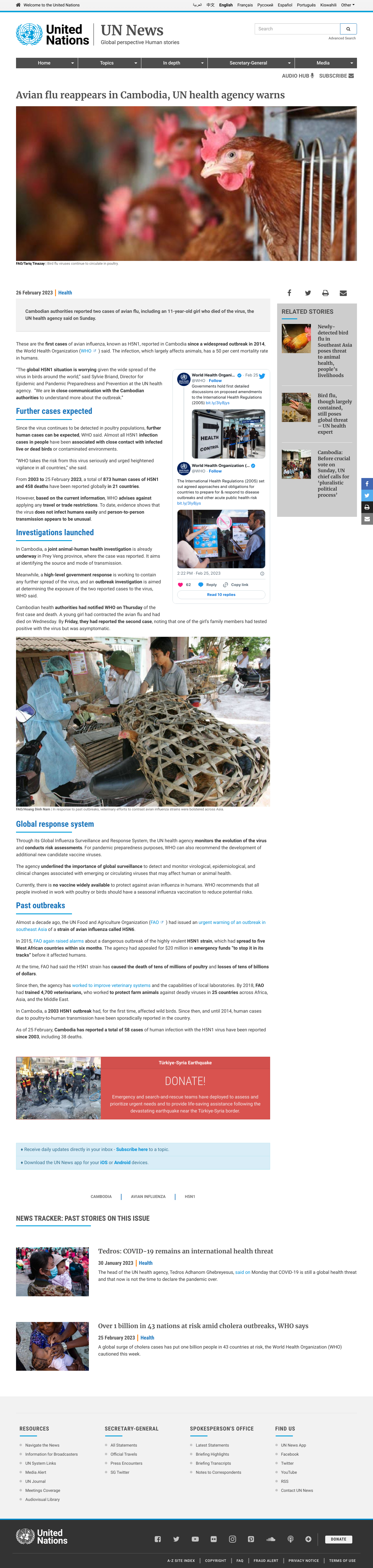 Avian flu reappears in Cambodia, UN health agency warns