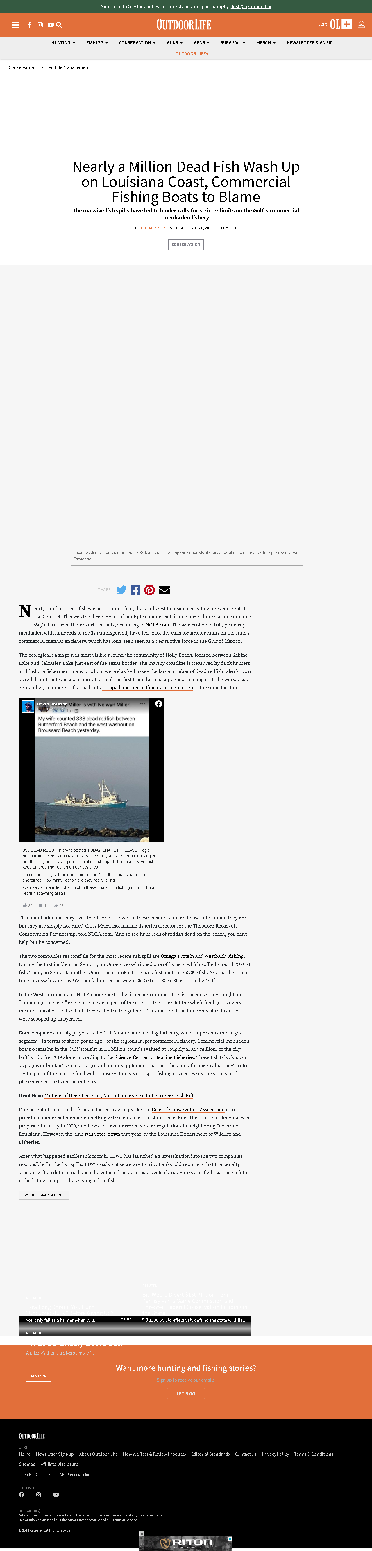 Nearly a million dead fish, including redfish and menhaden, washed ashore in southwest Louisiana due to commercial fishing boats dumping an estimated 850,000 fish from their overfilled nets, sparking calls for stricter limits on the state's commercial menhaden fishery.