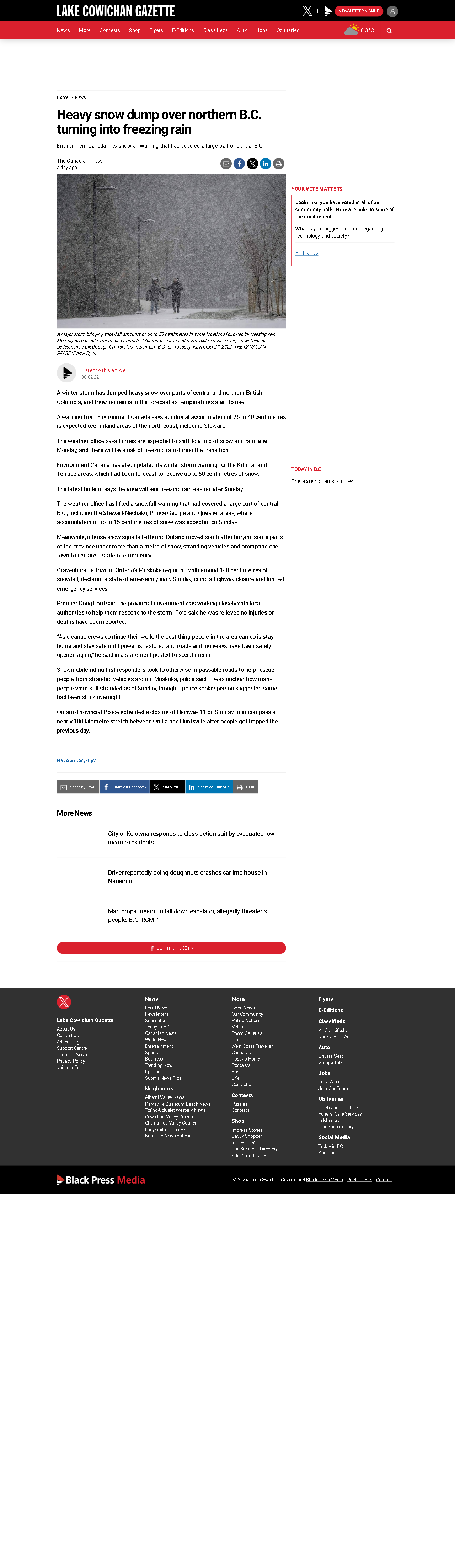 A major winter storm has hit northern and central British Columbia, delivering up to 50 cm of snow which is now turning into freezing rain as temperatures rise.