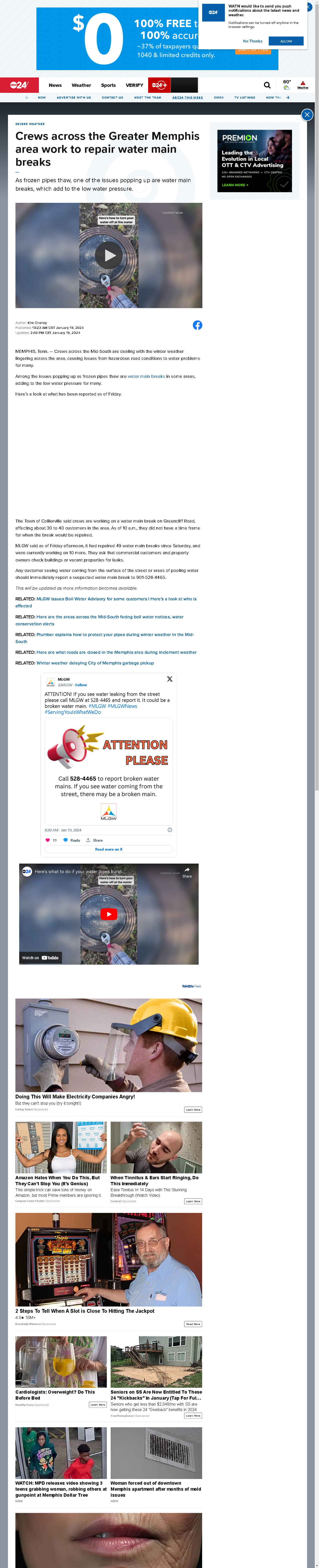 The Town of Collierville said crews are working on a water main break on Greencliff Road, affecting about 30 to 40 customers in the area. As of 10 a.m., they did not have a time frame for when the break would be repaired. MLGW said as of Friday afternoon, it had repaired 49 water main breaks since Saturday, and were currently working on 10 more. They ask that commercial customers and property owners check buildings or vacant properties for leaks.