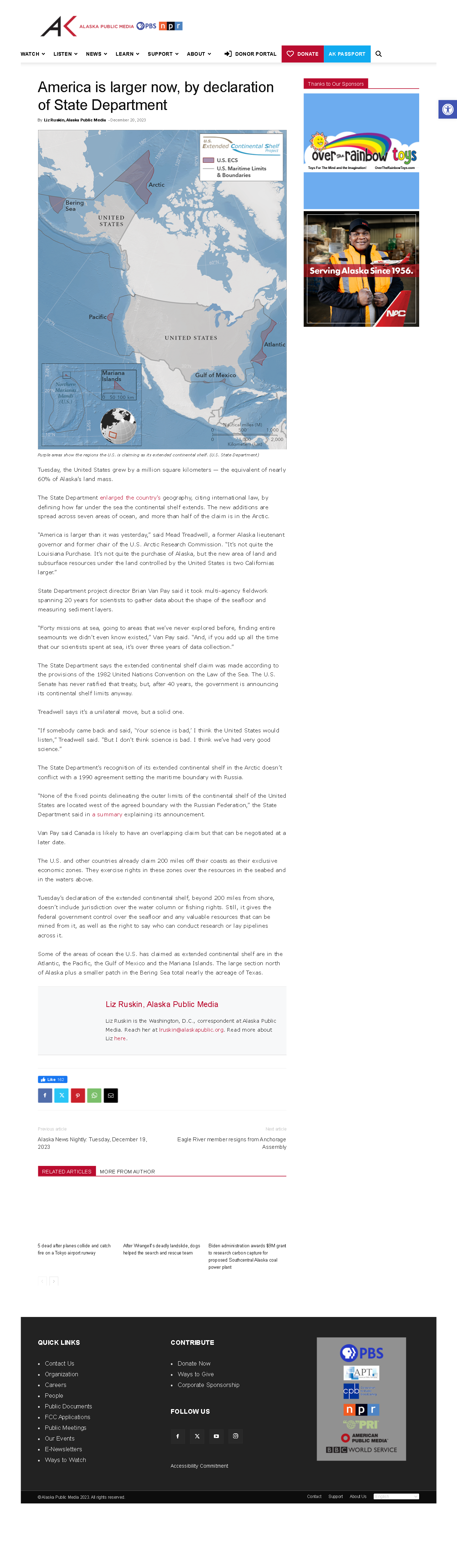 The U.S. State Department has expanded America's territory by defining the extent of its continental shelf, claiming an area roughly twice the size of California, mostly in the Arctic.