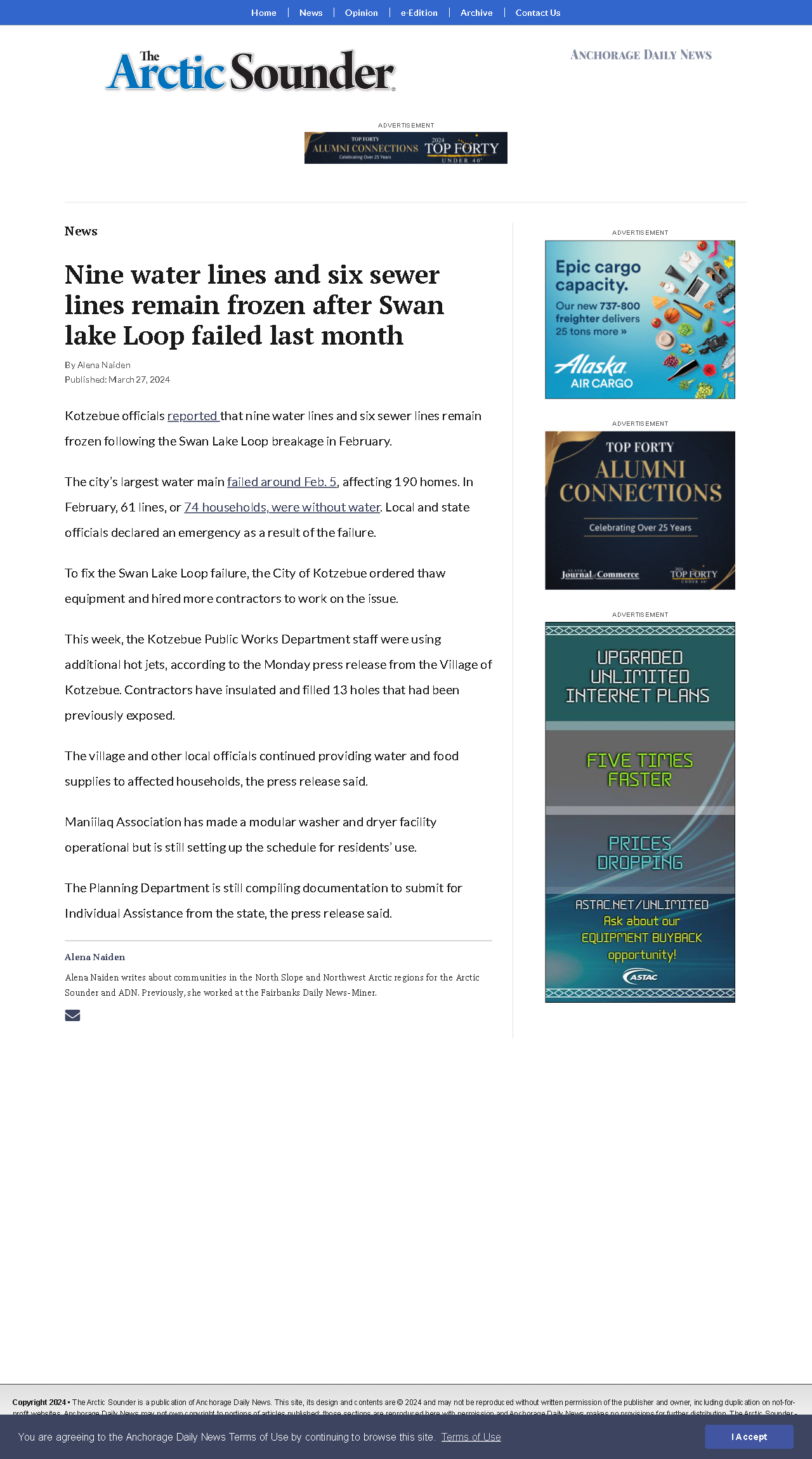 Emergency measures are in place in Kotzebue after a failure in the Swan Lake Loop left 74 households without water, prompting local and state officials to declare an emergency and take action to provide services and repair infrastructure.