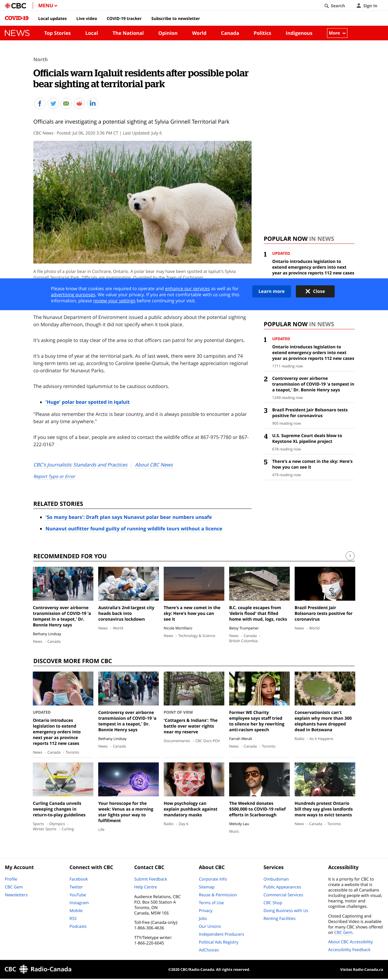 Officials are investigating a report that a polar bear was sighted at Sylvia Grinnell Territorial Park in Iqaluit.