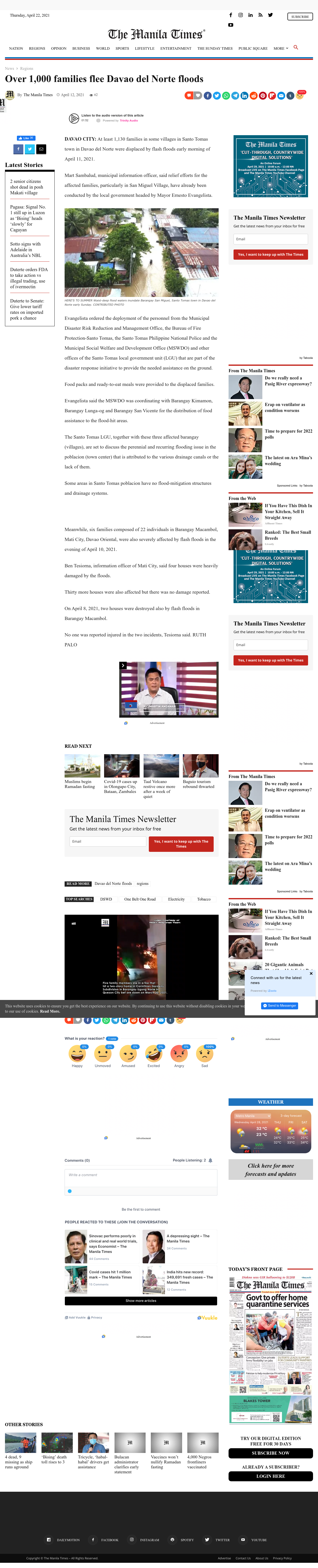 At least 1,130 families in some villages in Santo Tomas town in Davao del Norte were displaced by flash floods early morning of April 11, 2021. The Santo Tomas LGU, together with these three affected barangay (villages), are set to discuss the reoccurring flooding issue attributed to the various drainage canals or the lack of them.
