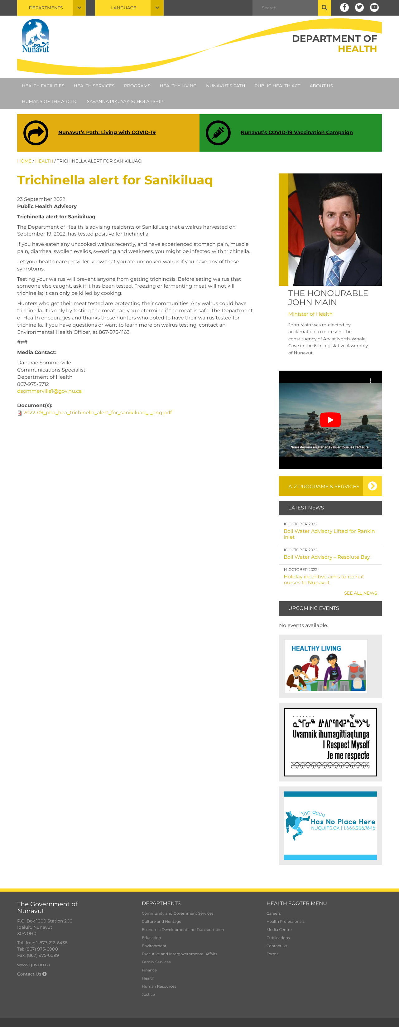 The Department of Health is advising residents of Sanikiluaq that a walrus harvested on September 19, 2022, has tested positive for trichinella.