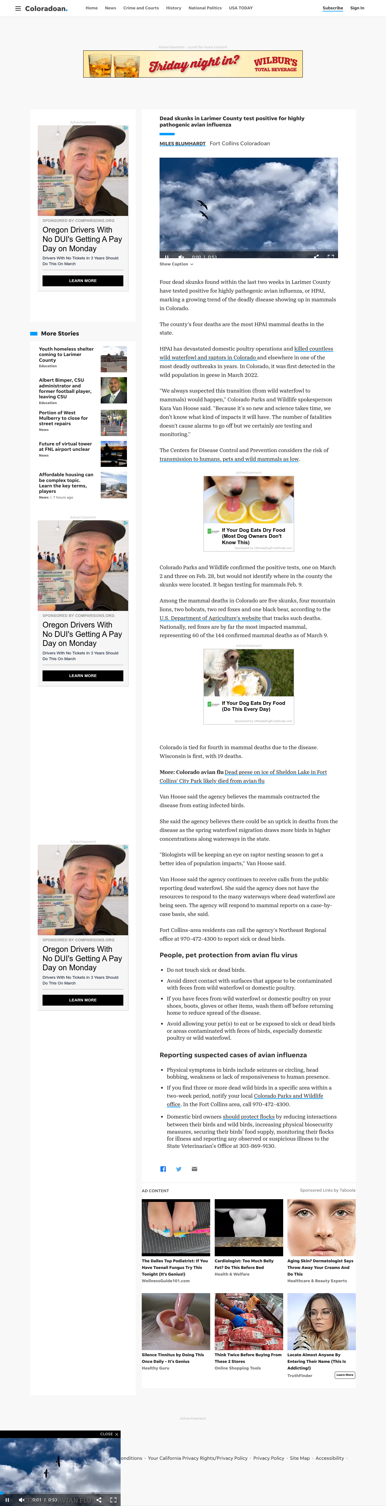 Dead skunks in Larimer County test positive for highly pathogenic avian influenza