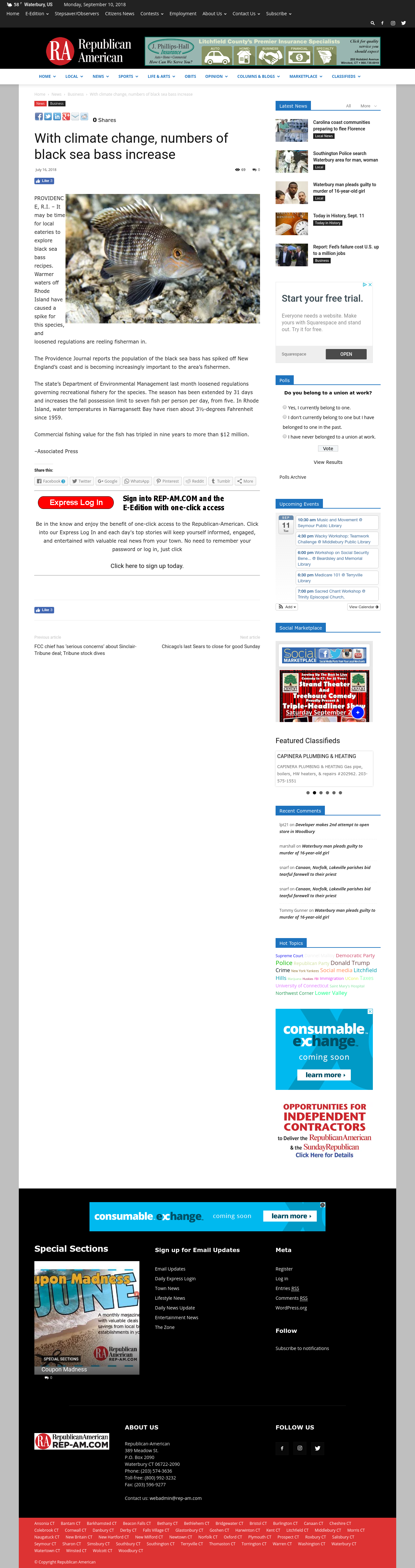 PROVIDENCE, R.I. – It may be time for local eateries to explore black sea bass recipes. Warmer waters off Rhode Island have caused a spike for this species, and loosened regulations are reeli…