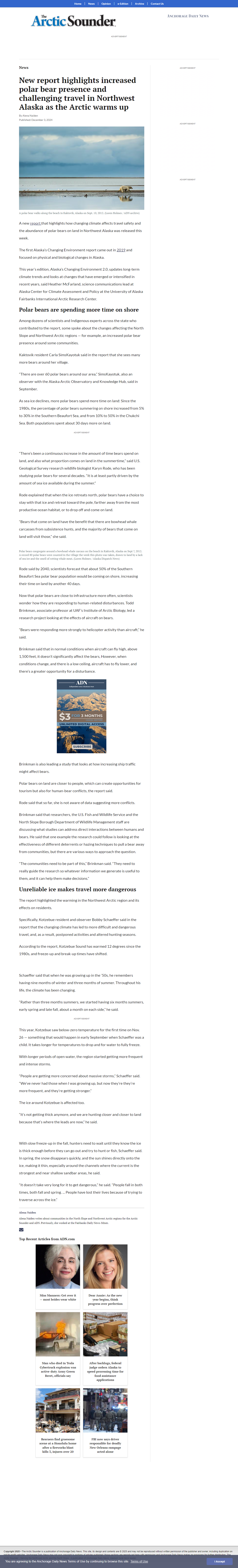 The report reveals an unusual increase in polar bear presence on land in Northwest Alaska due to declining sea ice, posing challenges for human-bear interactions and travel safety, while warming temperatures and shifting seasons complicate traditional travel and hunting practices.