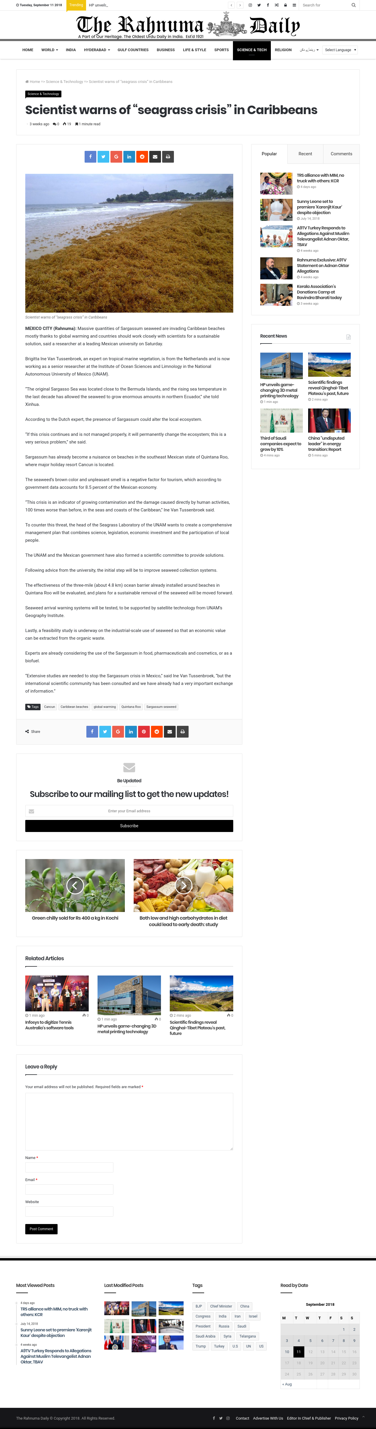 Scientist warns of "seagrass crisis" in Caribbeans MEXICO CITY (Rahnuma): Massive quantities of Sargassum seaweed are invading Caribbean beaches mostly thanks to global warming and countries should work closely with scientists for a sustainable solution, said a researcher at a leading Mexican university on
