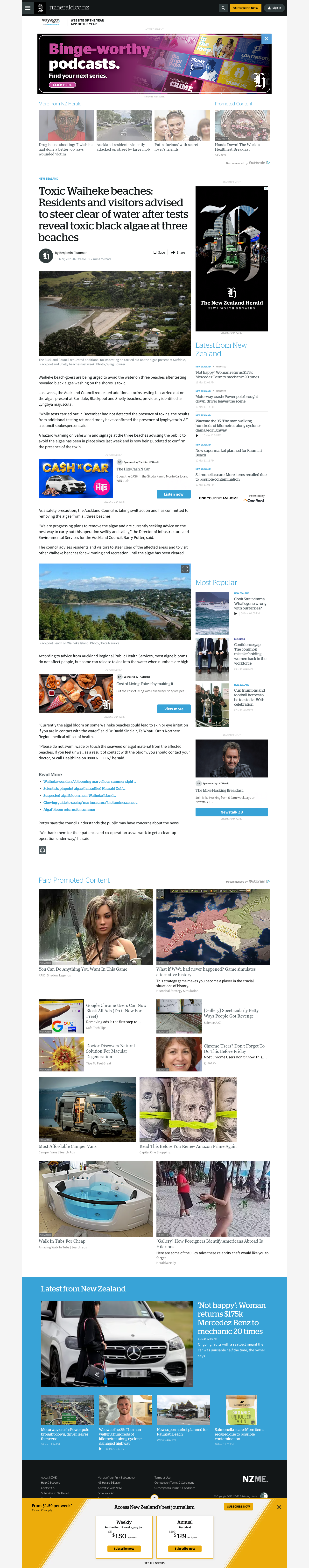 Testing has revealed black algae washing on Waiheke shores is toxic. “Currently the algal bloom on some Waiheke beaches could lead to skin or eye irritation if you are in contact with the water,” said Dr David Sinclair, Te Whatu Ora’s Northern Region medical officer of health.