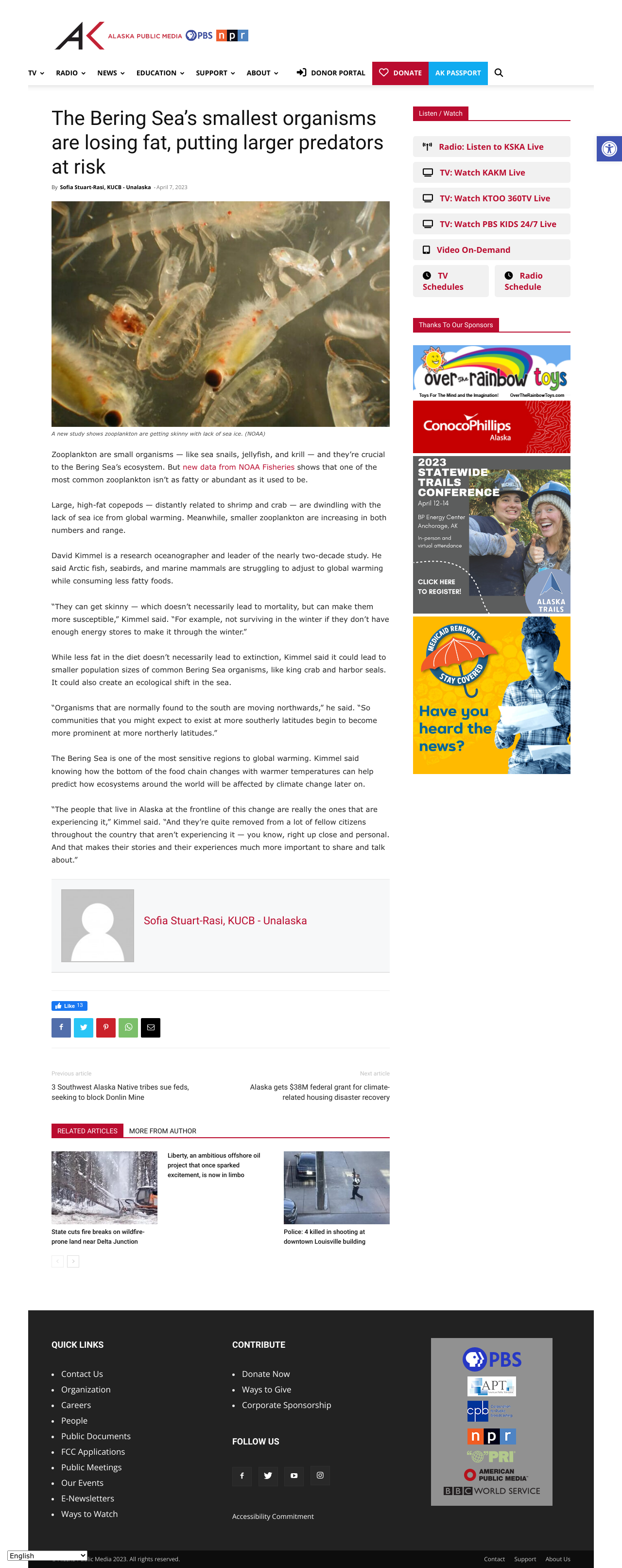 Large, high-fat copepods — distantly related to shrimp and crab — are dwindling and loosing fat with the lack of sea ice from global warming.