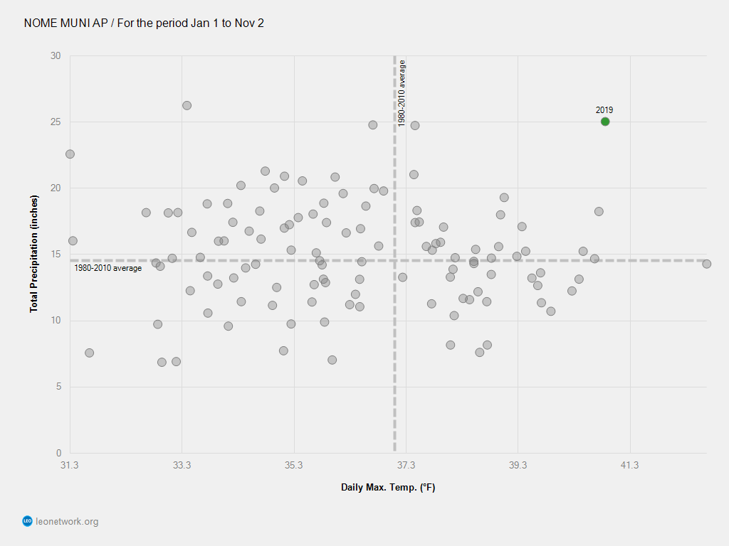 This year has been the second-warmest and second-wettest on record (Nome weather station). These conditions are accelerating permafrost thaw in some areas and resulting in land subsidence and erosion (see Johnee Seetot's photos).
